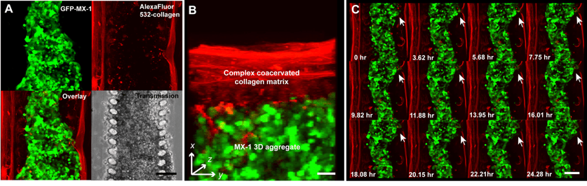 Live visualisation and tracking of breast cancer cells migrating across an ECM barrier in a microfluidic 3D tumor model